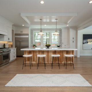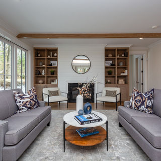 Timeless modern farmhouse featuring spacious rooms and oversized windows. Four second-floor en-suite bedrooms, including a stunning primary suite with custom closet and spa bath with double quartz vanity, soaking tub, and tiled shower. Flexible first floor offers an optional en-suite bedroom or office. Open-concept kitchen with high-end stainless appliances, white inset cabinetry, quartz counters, breakfast nook, and a 10-foot island with seating. Lower level includes a playroom, wet bar, gym, bedroom, and full bath. Exceptional millwork, vaulted and coffered ceilings, designer finishes, built-ins, mudroom, and butler’s pantry complete this dream home.